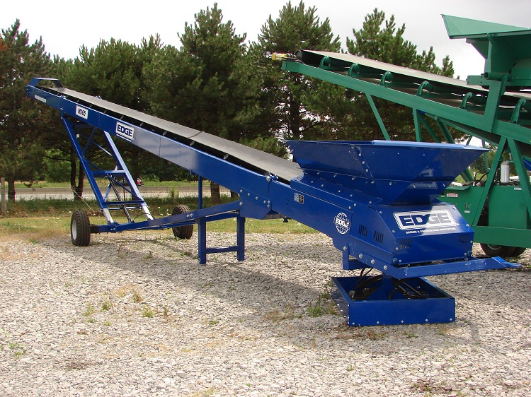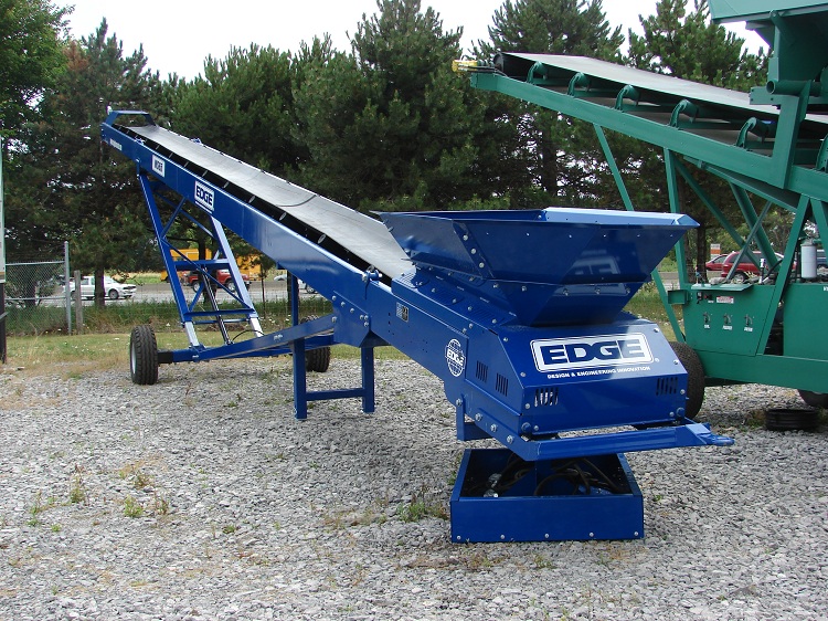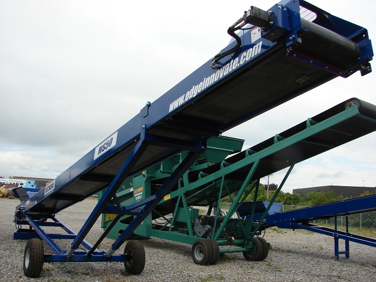 The Edge model MS50 portable, 50' radial stacker comes equipped for Ontario stock with a 32" belt with a vulcanized splice and self lubricating triple seal bearings. Powered with hydraulic drive, it can be operated from most portable trommel or flat deck screening plants. Hydraulic raise and lower is also standard as is the extended feed hopper, plant mounted hydraulic control valve bank and 30' hose coupling kit with quick disconnects. The high stockpile capacity from 13' 10" to a maximum of 26' 5" makes this stacker a great addition to an existing plant or spread.